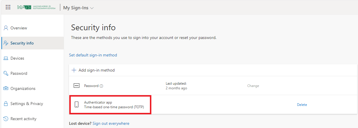 2. Log in at https://myaccount.microsoft.com with your MATE ID (ending with @uni-mate.hu, e.g. Abc1234@uni-mate.hu) and the password you set on the JoKeR site. If you logged in successfully, click on the Security info menu.