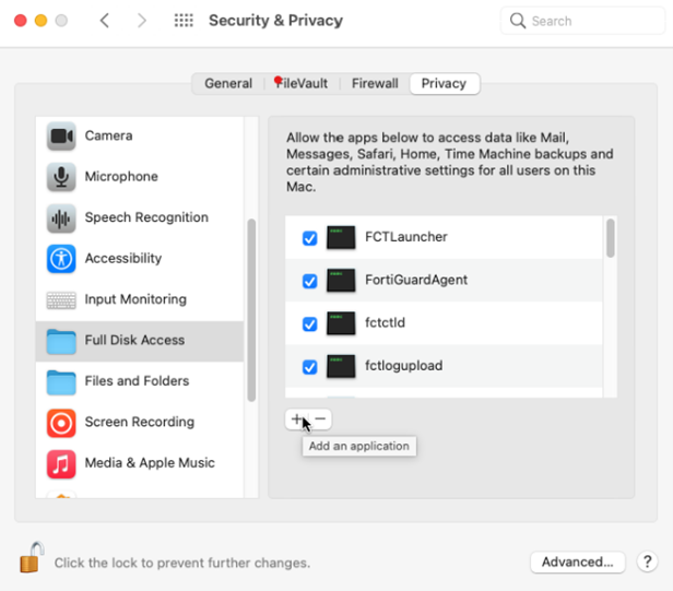 In the table above, select the Full Disk Access menu item, then in the table below, use the + sign to add the programs under /Library/Application Support/Fortinet/FortiClient/bin, e.g.: FCTLauncher, FortiGuardAgent, fctctld.