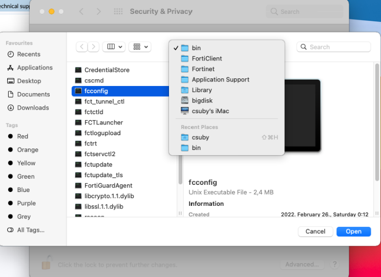 Add the required permissions to the various FortiClient VPN processes in the system prompts. If you fail to do so, follow the steps below.