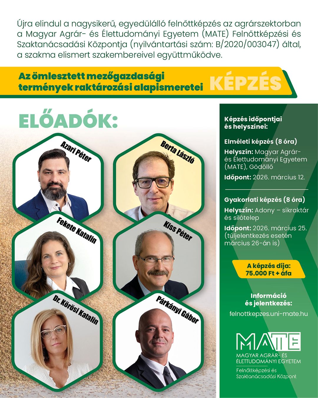 A Magyar Agrár- és Élettudományi Egyetem (MATE) Felnőttképzési és Szaktanácsadási Központja (nyilvántartási szám: B/2020/003047) „Az ömlesztett mezőgazdasági termények raktározási alapismeretei” címmel hirdeti meg gyakorlatorientált, hiánypótló felnőttképzését. A program célja, hogy az agrárszektor szereplői számára olyan, azonnal hasznosítható elméleti és gyakorlati tudást nyújtson, amely közvetlenül támogatja a termények minőségének megőrzését, az értékesíthetőség fenntartását, valamint a gazdálkodói és vállalati eredményesség javítását.