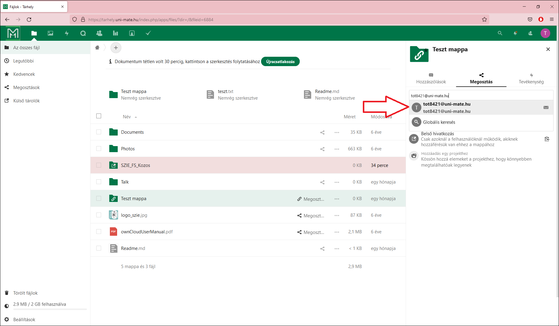 2. A megjelenő ablakban a Név vagy e-mail cím... mezőbe kezdje el gépelni annak a személynek vagy csoportnak az e-mail címét, akivel meg szeretné osztani az állományt. Belső(uni-mate.hu) és külső cím esetén is a teljes e-mail cím megadása szükséges.