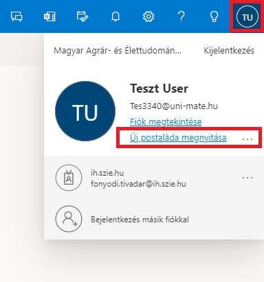 2. A jobb felső sarokban kattintson a monogramjára és a menüből válassza az Új postaláda megnyitása lehetőséget.
