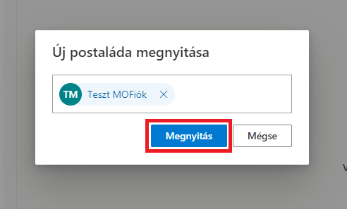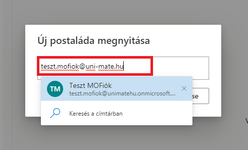3. A megjelenő ablakban kezdje el beírni a megnyitni kívánt e-mail címet. Ha a cím megjelenik a találatok között, válassza ki. Ha nem, írja be a teljes e-mail címet és nyugtázza az Enterrel a bevitelt és kattintson a Megnyitás gombra.