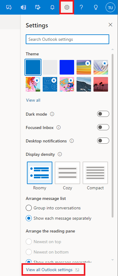 - Kattintson a jobb felső sarokban a fogaskerék ikonra, majd a megjelenő panelen a View all Outlook settings hivatkozásra.