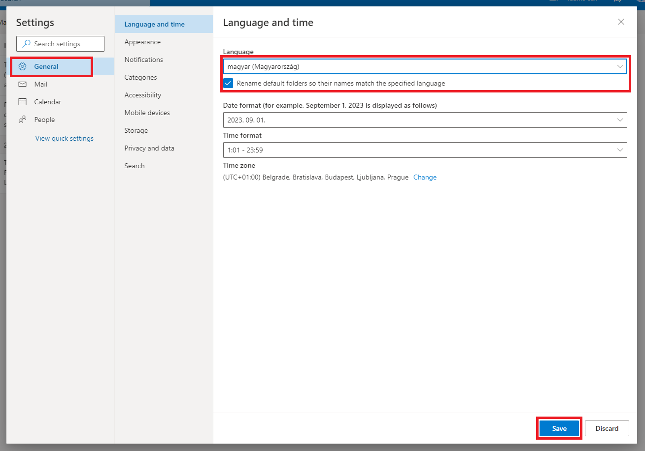 - A beállítások mentése után az ablak nyelve rögtön magyarra változik. Zárja be a beállításokat a jobb felső sarokban lévő X ikonon való kattintással. Előfordulhat, hogy a mappanevek csak a lap frissítése után fognak a kiválasztott nyelvűre frissülni. Az Outlook asztali alkalmazásban is ezen lépésk végrehajtása után változnak magyarra a mappanevek.