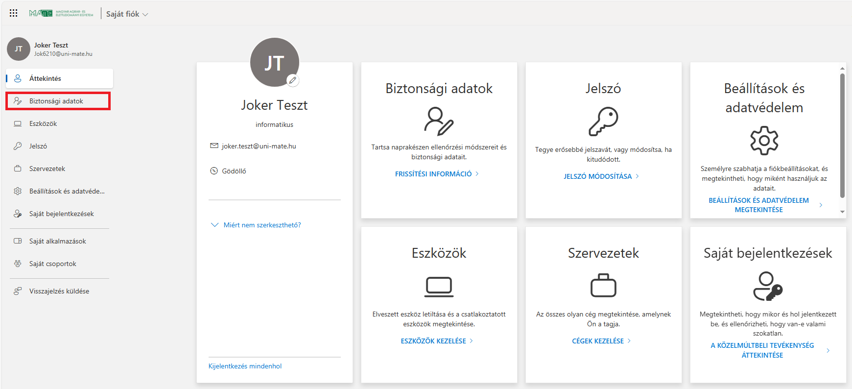 2. Jelentkezzen be a https://myaccount.microsoft.com oldalon a MATE azonosítójával (kiegészítve azt a @uni-mate.hu végződéssel, pl.: Abc1234@uni-mate.hu) és a JoKeR felületen módosított jelszavával. Ha sikeresen bejelentkezett kattintson a Biztonsági adatok menüpontra.