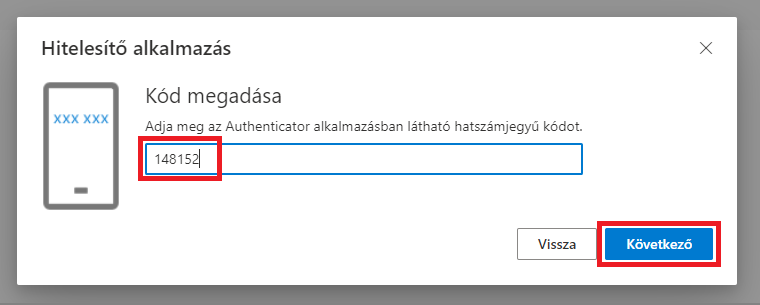 majd a megjelenő ablakban adja meg az előzőleg kimásolt hitelesítő kódot és kattintson ismét a Következő gombra.