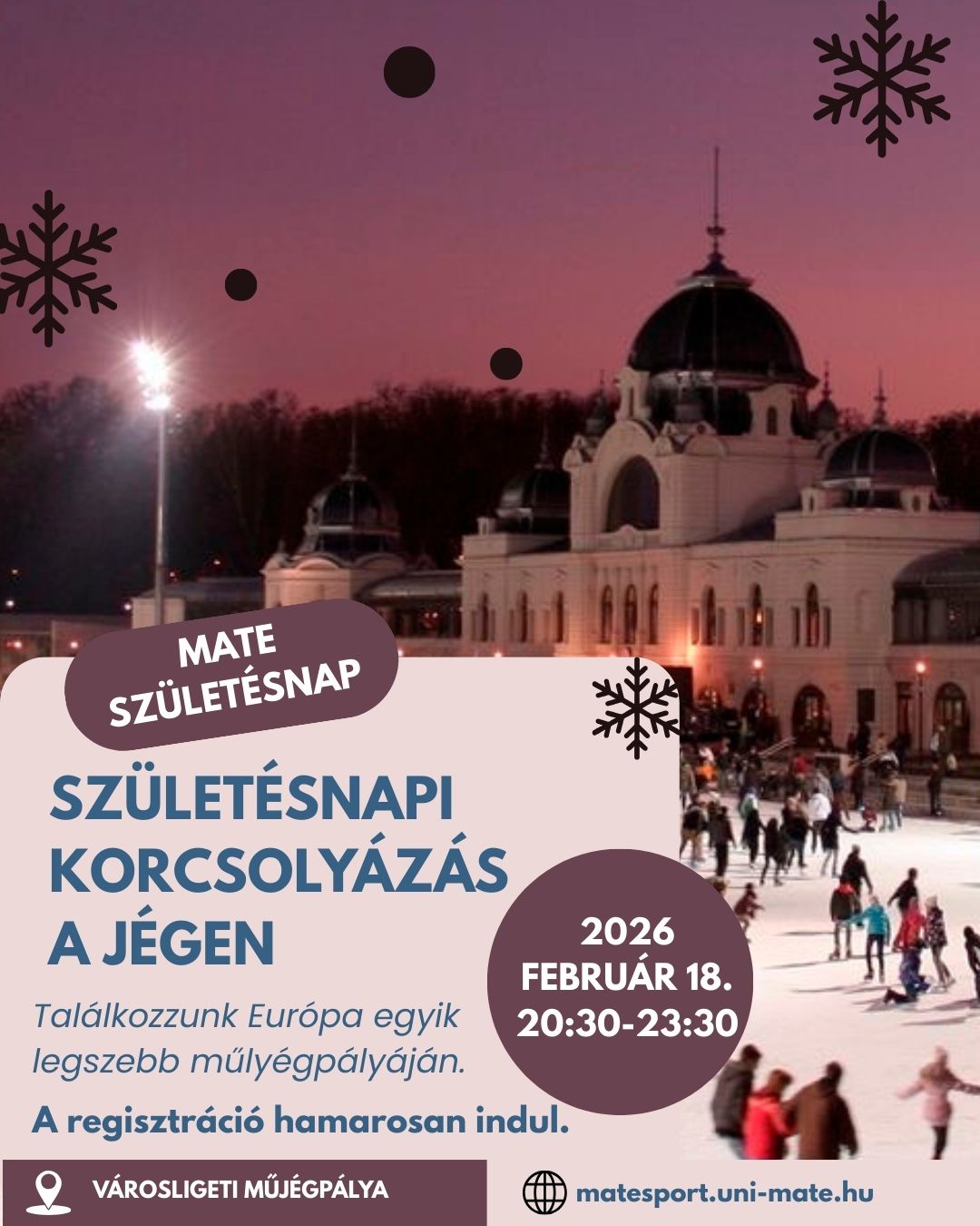 We are excited to announce that we will once again be hosting the MATE Birthday Skate, an excellent opportunity to celebrate the university’s anniversary together while enjoying ice skating and good company. During the event, you will have the chance to skate at the beautiful Városligeti Ice Rink, where we will welcome participants with music, refreshments, and a friendly atmosphere.